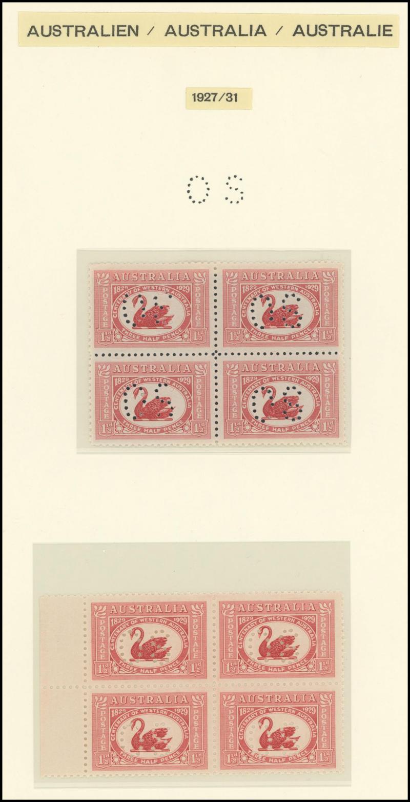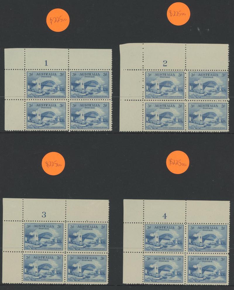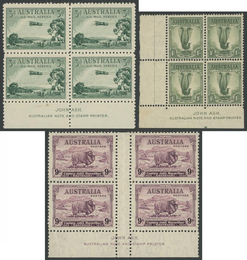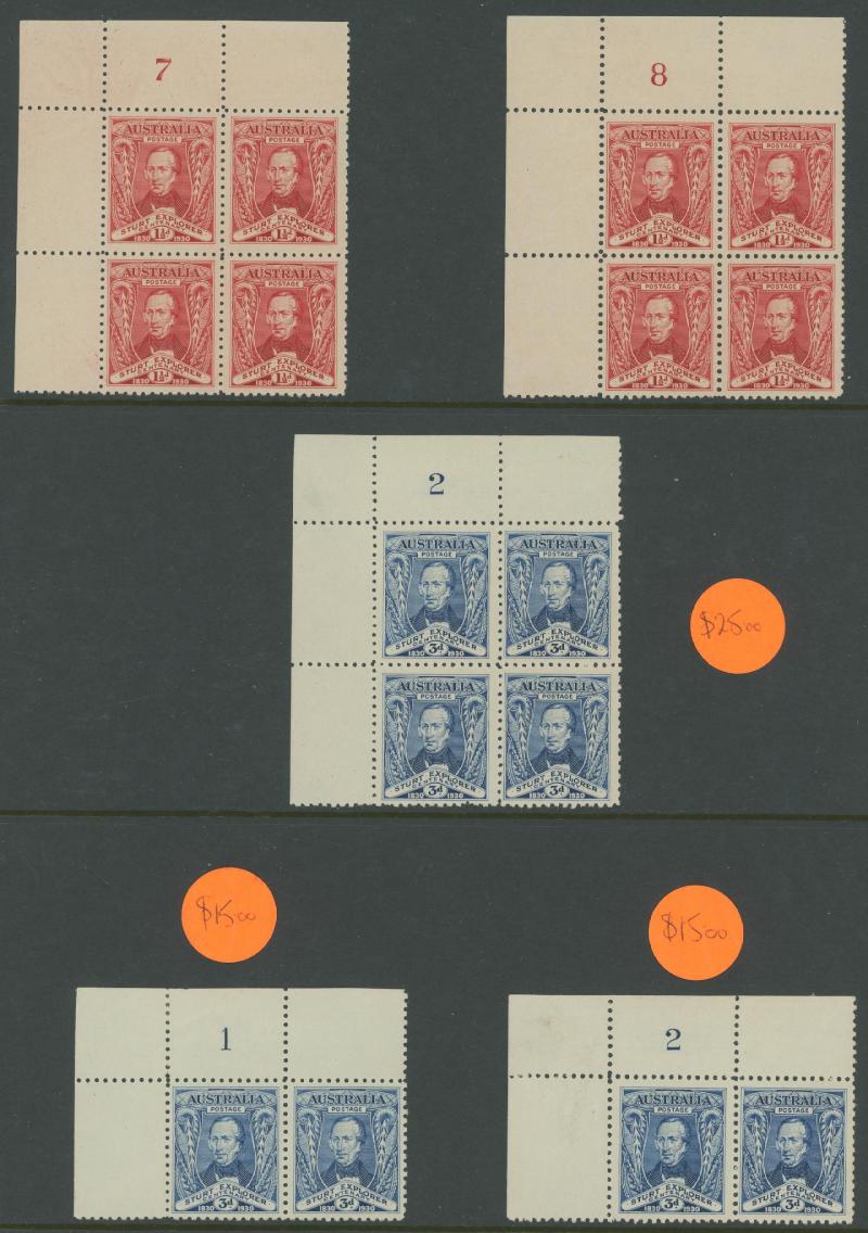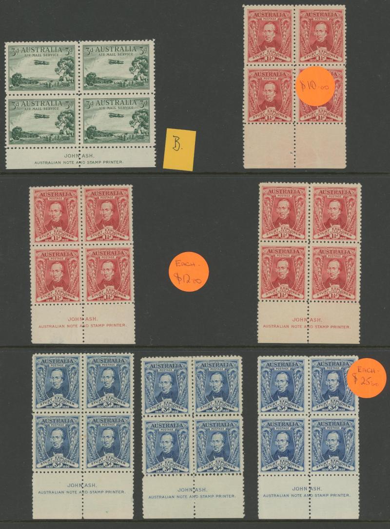 (5x2), 1926 Swan Plate Numbers '1' to '12' set, 1930 Sturt 1½d Plates '1' to '8' set, Kingsford Smith set and 2d Plates '1' to '8' set, Airmail 6d imprint strip of 3 and block of 6 (3x2), Bridge 3d Plates '1' to '4' and overprinted 'OS' 2d plus 2d