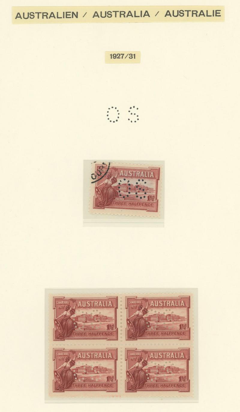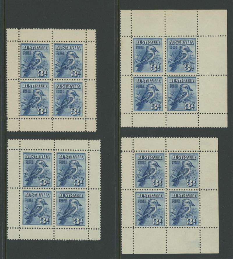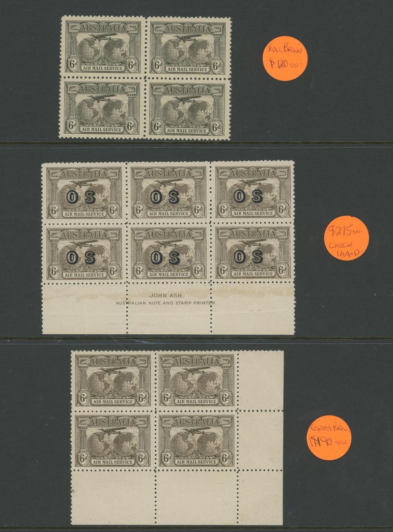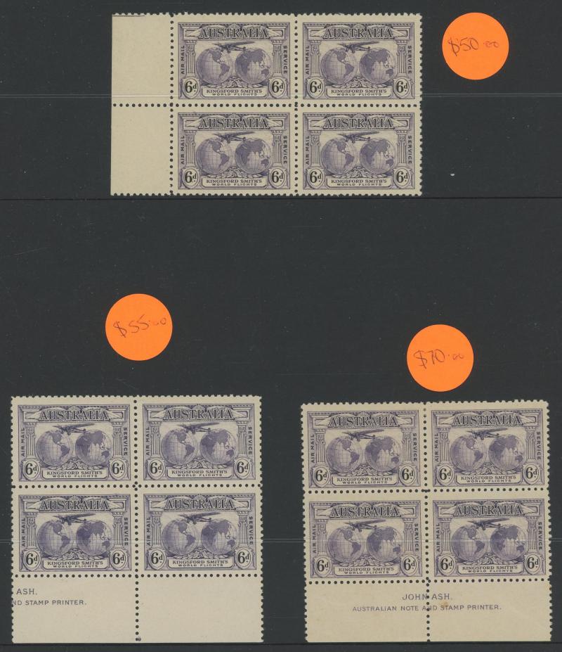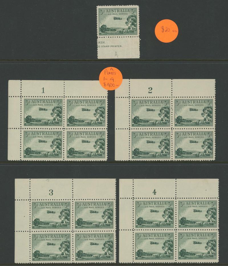 (5x2), 1926 Swan Plate Numbers '1' to '12' set, 1930 Sturt 1½d Plates '1' to '8' set, Kingsford Smith set and 2d Plates '1' to '8' set, Airmail 6d imprint strip of 3 and block of 6 (3x2), Bridge 3d Plates '1' to '4' and overprinted 'OS' 2d plus 2d