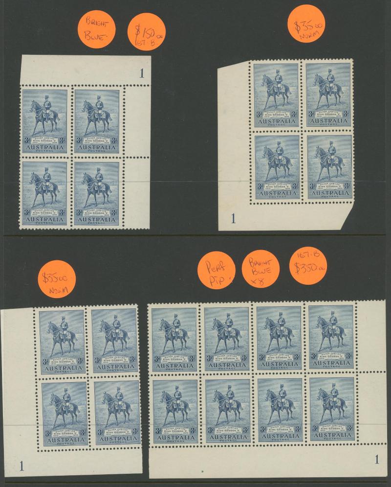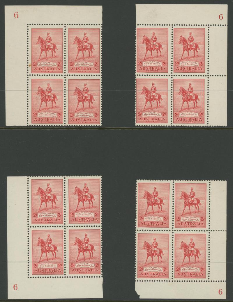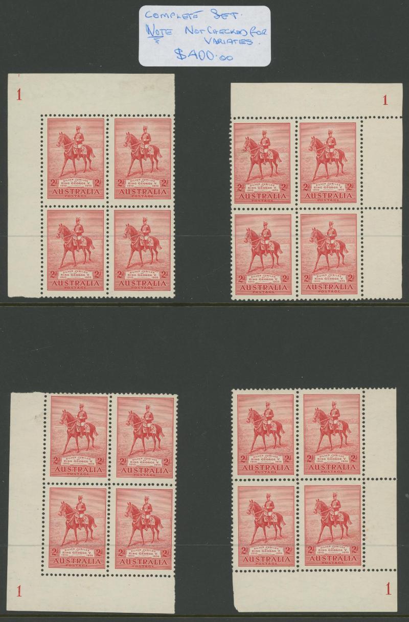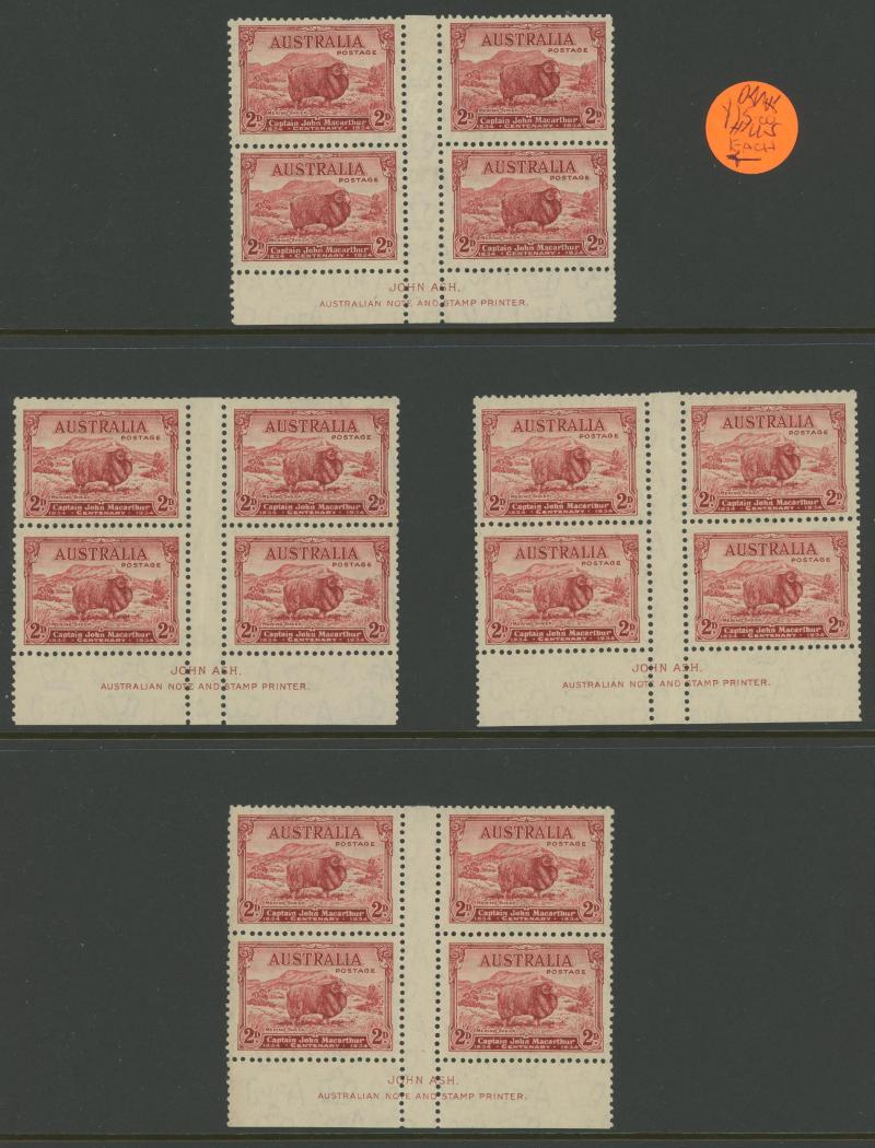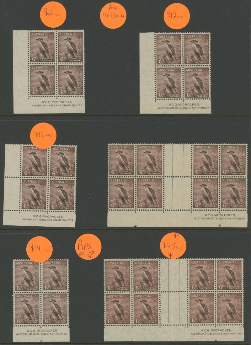 and 3d imprints, Large Kookaburra imprint x2, MacArthur imprints including 2d Dark Hills, Jubilee Plates 2d '1' to '6' all positions and 3d '1' three positions noted "not checked for varieties", Sturt Centenary imprints, NSW Sesquicentenary imprints,