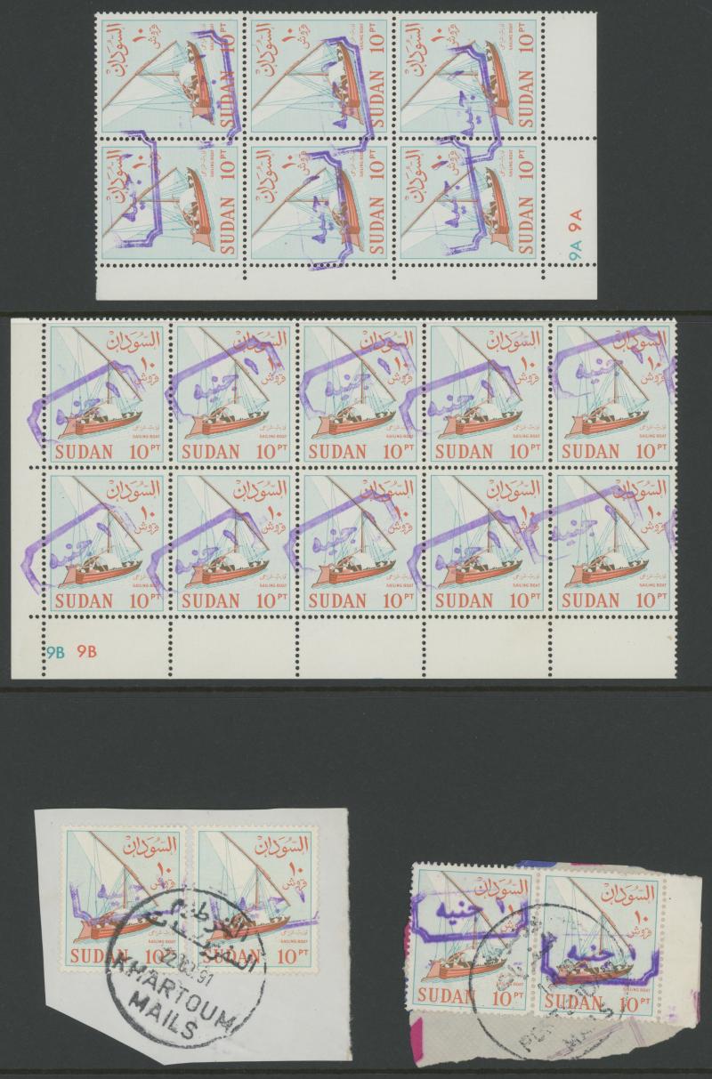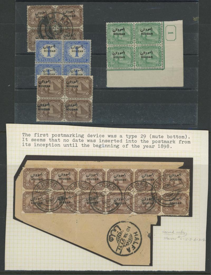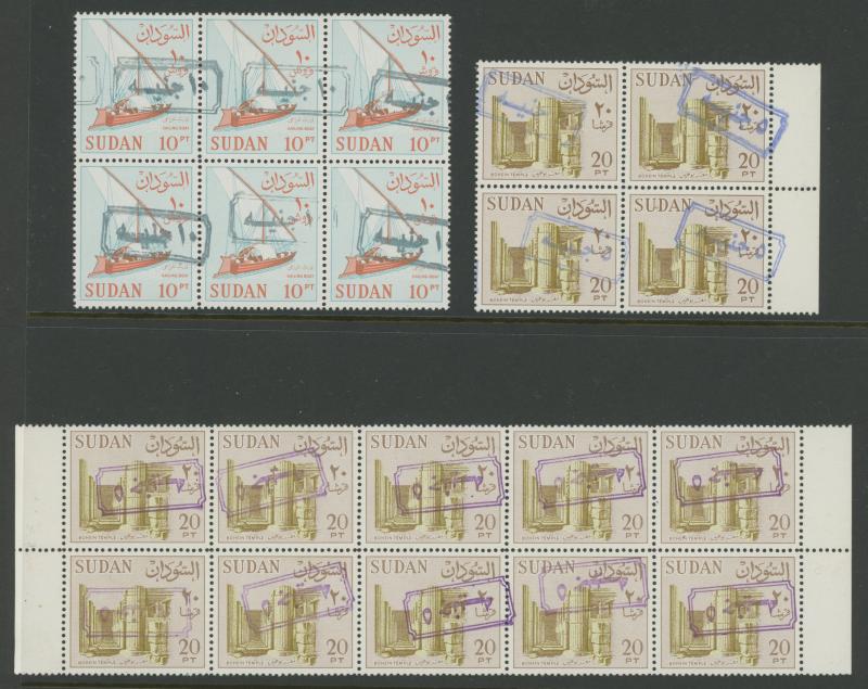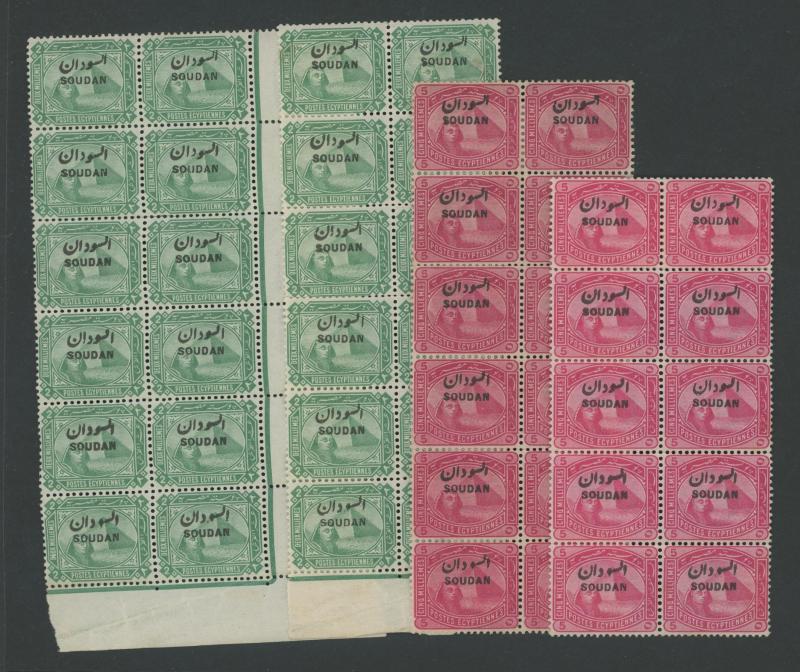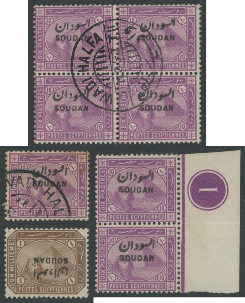 HALFA' cds, 1m with the Overprint Misplaced block of 4, 1m blocks of 4 with superb 'KORTI' cds and of 12 (6x2) with superb 'BERBER' cancel without dates, 1m with the Overprint Inverted, 3m blocks of 18 & 33 and 5m block of 38 each with a few