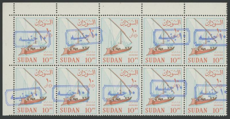 Omitted from Two Units), in Blue block of 4, and in Violet block of 10 (5x2) all with the Surcharge Inverted with Arabic '0' (5) at Left; £10 on 10pi Scott 368C in Blue-Black block of 6 (3x2) & vertical strip of 5, and in Blue on corner block of 10