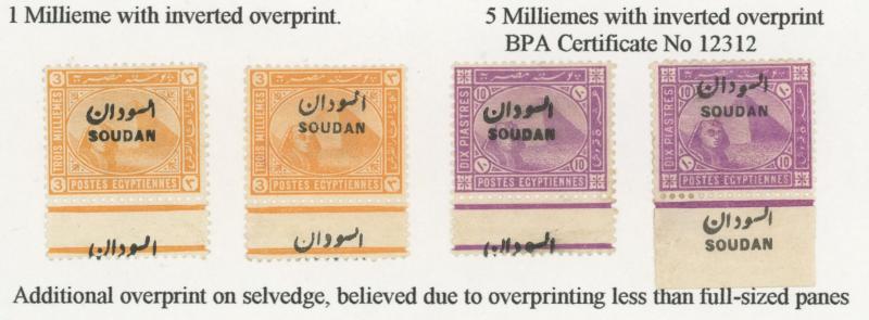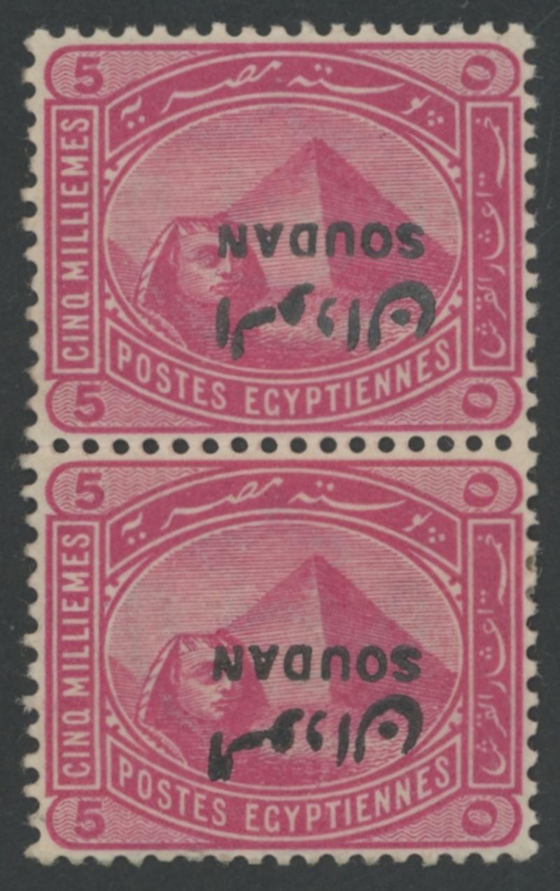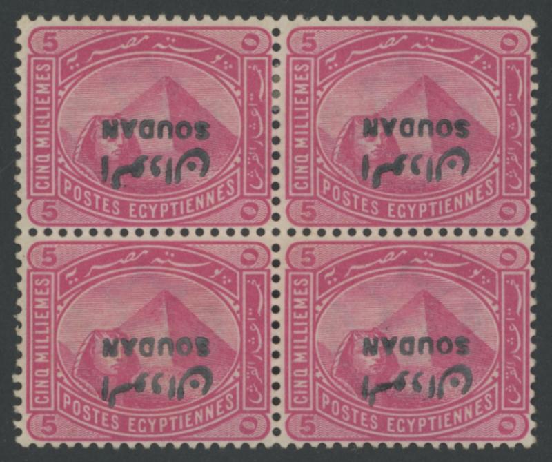 1897 'SOUDAN' Overprints on Egypt 5m rose-carmine with the Overprint Inverted SG 5a block of 4, lightly mounted, Cat £1200+. Not