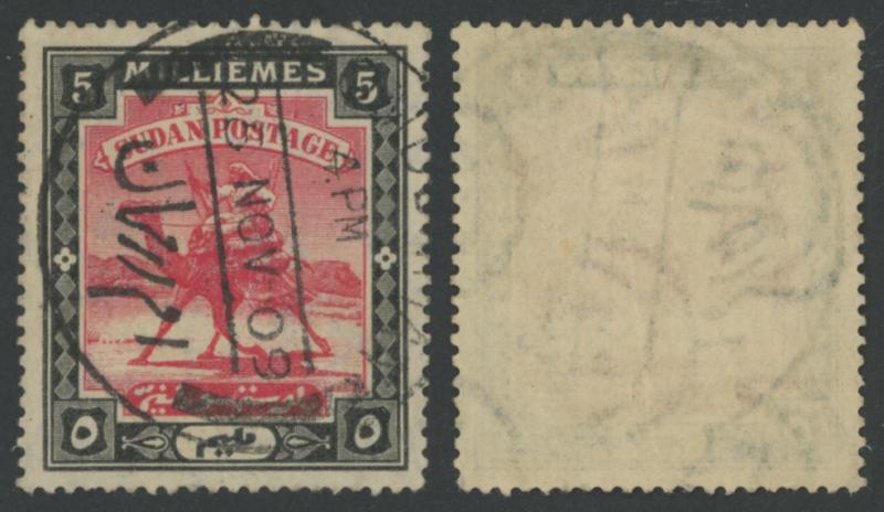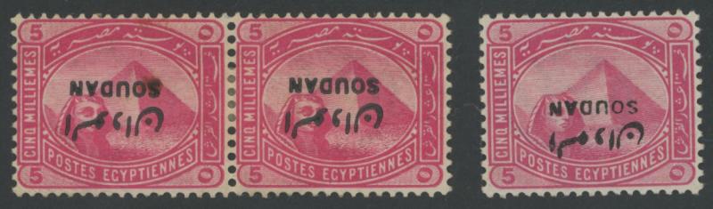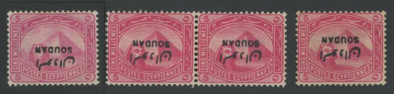 1897 'SOUDAN' Overprints on Egypt 5m rose-carmine with the Overprint Inverted SG 5a singles x3, pairs x2 & vertical strip of 3,