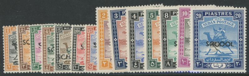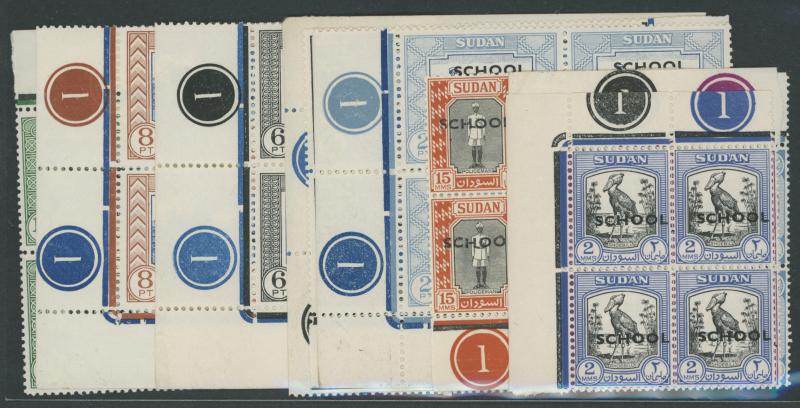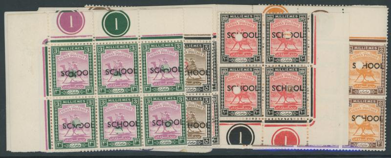 denominations to 10pi Plate Number blocks of 4, all overprinted 'SCHOOL' and each unit with a central punch-hole, unmounted. Superb.