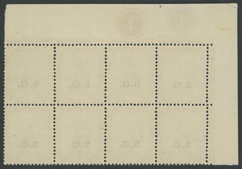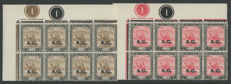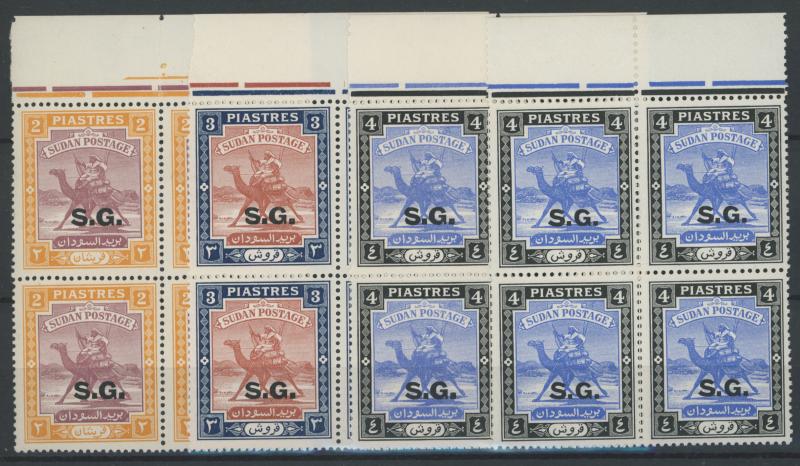 OFFICIAL STAMPS: 1948 'S.G.' Overprints 1m to 15m SG O43-49 upper-left corner blocks of 8 (4x2) each except the 2m & 4m with 'nun'
