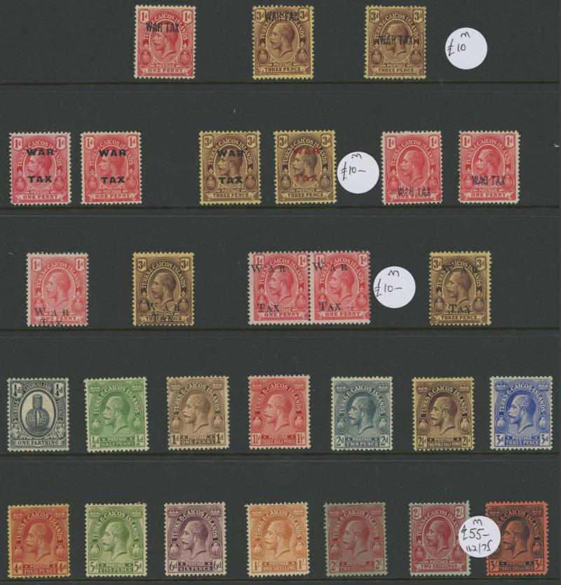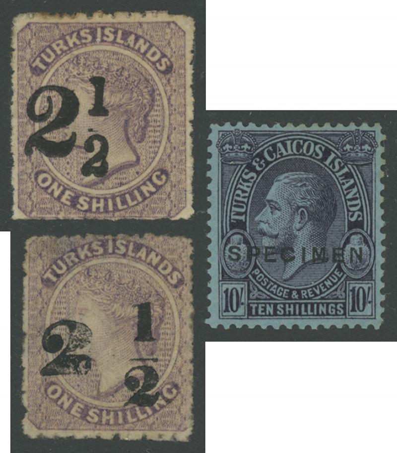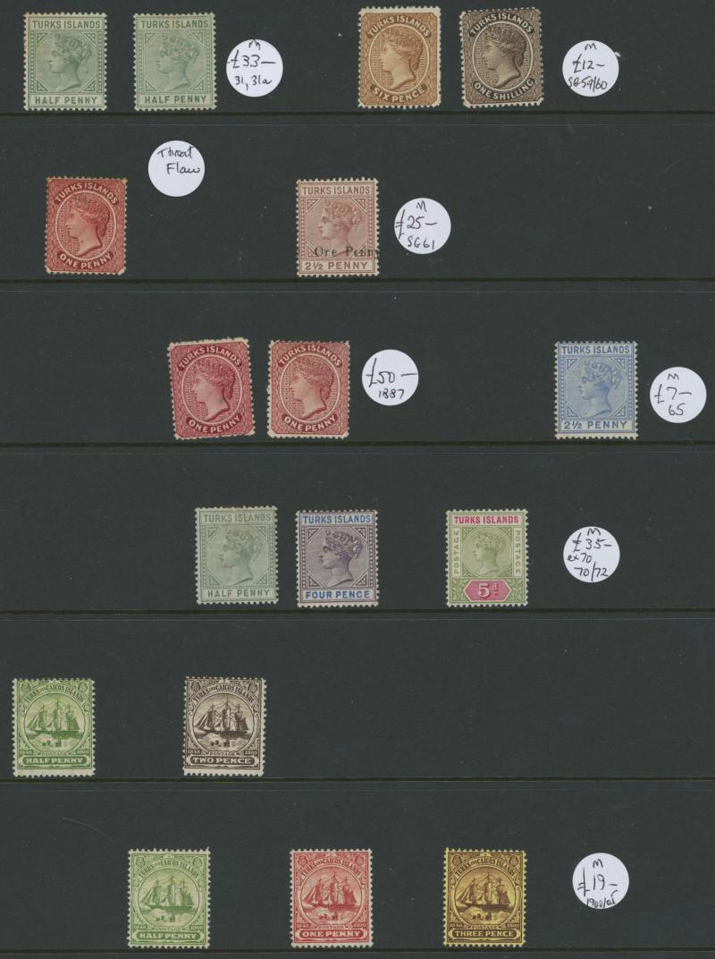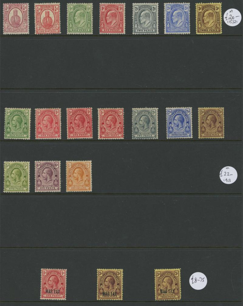 (Certificate) & unused, '2½' on 1/- SG 29 * and SG 36 * (small thin; Certificate), and '4' on 6d unused, 1881 Crown CC Wmk Sideways 1d brown-red *; Turks & Caicos Islands 1900-08 Badge set *, 1909-11 KEVII set * plus used range including 2/- & 3/-,