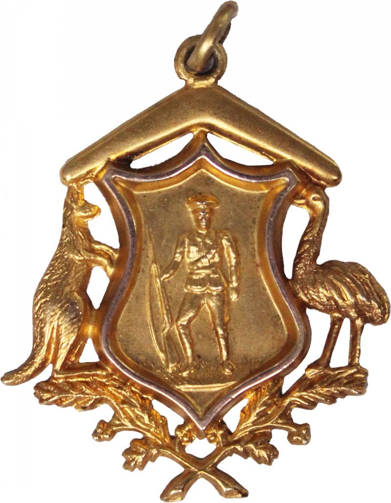 AUSTRALIA: 1919 Returned Servicemen gold fob (9ct 5g) soldier flanked by kangaroo and emu, boomerang above with suspension loop,
