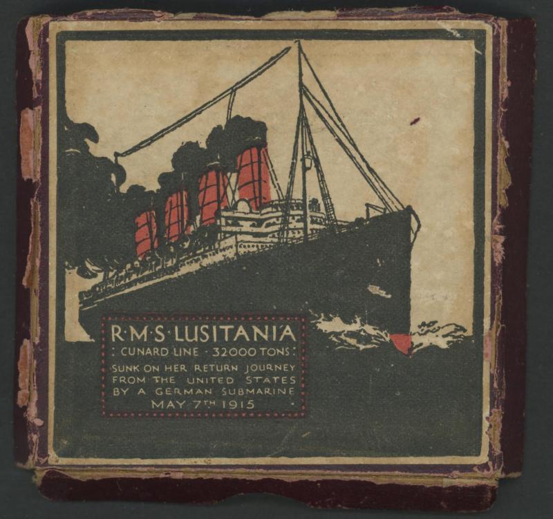 with aircraft and cannon on deck, rev. Death selling tickets at Cunard office, man in queue reading a paper warning of U-boat activity, in original box (separated lid) with leaflet, Uncirculated. (Image1) (Image2)