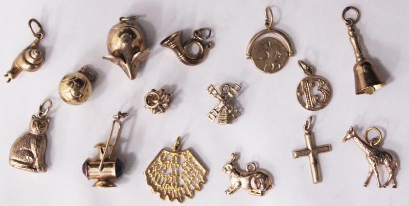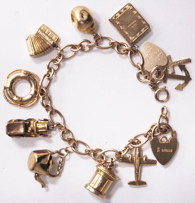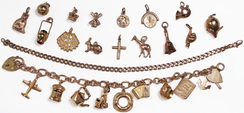 car, lifering, aeroplane, etc; plus additional bracelet (215mm 9ct 7g) and 9ct charms (x15, 17g) including giraffe, rabbit, cat, snail, bell, lamp, crown, windmill, fan (15ct), etc, virtually all hallmarked. (bracelets x2 + 26 charms) (Image1) (Image2)