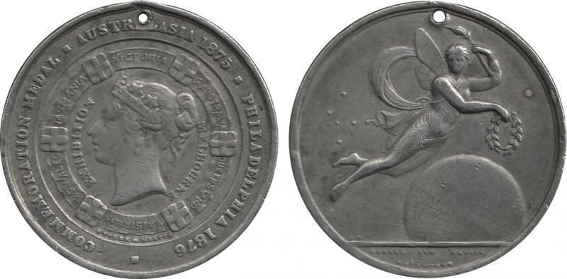 Martin, obv. Queen Victoria surrounded by 'states', 'COMMEMORATION MEDAL AUSTRALASIA 1875 PHILADELPHIA 1876', Rev. Victory flying above globe from Australia to USA offering victor's wreath, Southern Cross behind, pierced, some surface marks, VF. Very