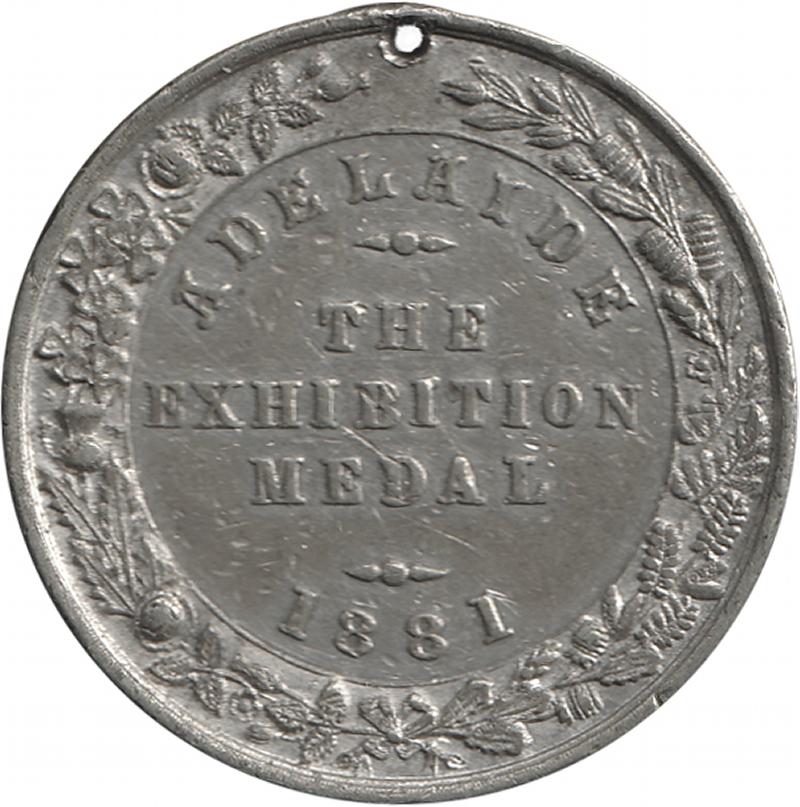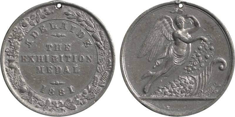AUSTRALIA: 1881 Adelaide Exhibition (38mm white metal), C 1881/15, by Stokes & Martin, rev. Victory flying showering fruits and