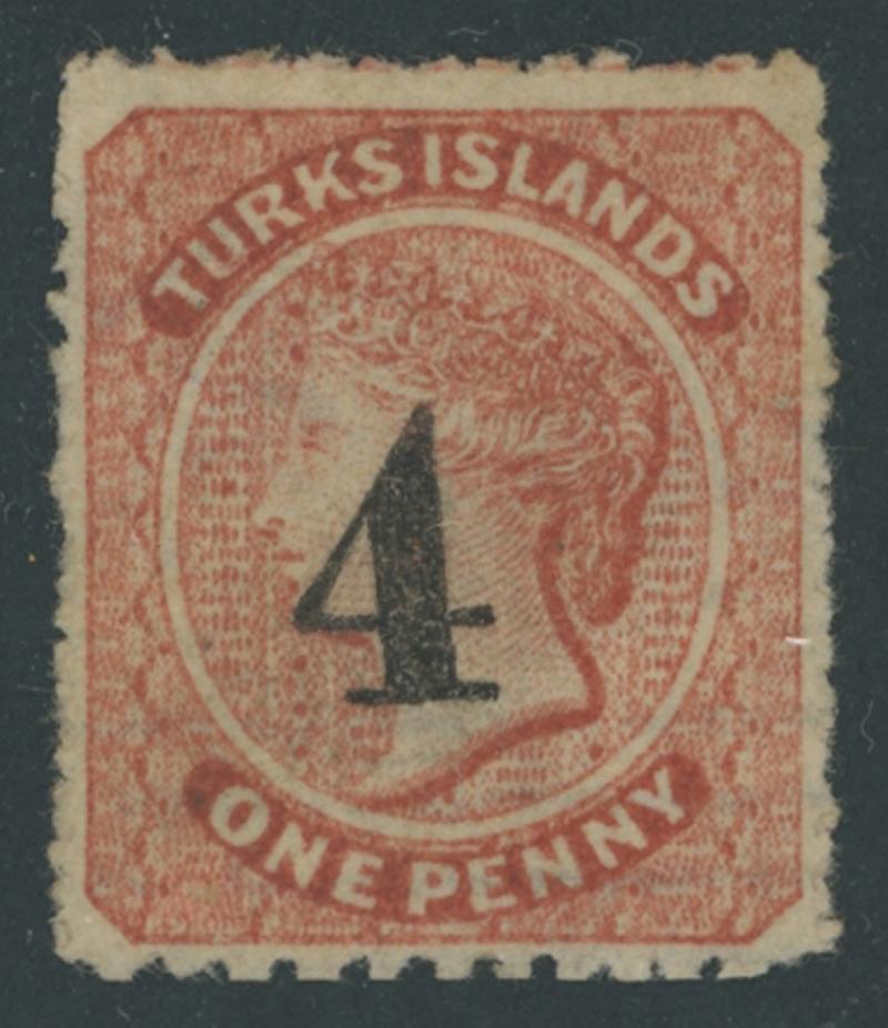 1881 Turks Islands Local Surcharges on QV '4' Type 28 (Pointed Top) on 1d dull red SG 48, well-centred for this issue,