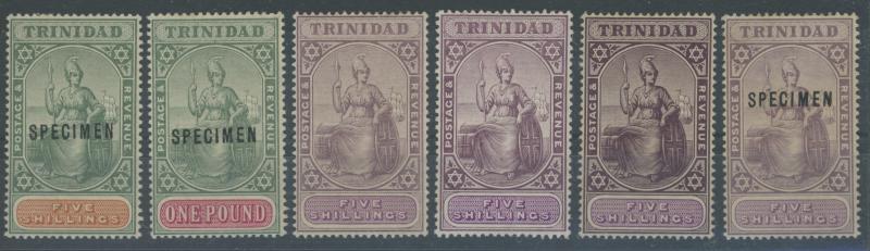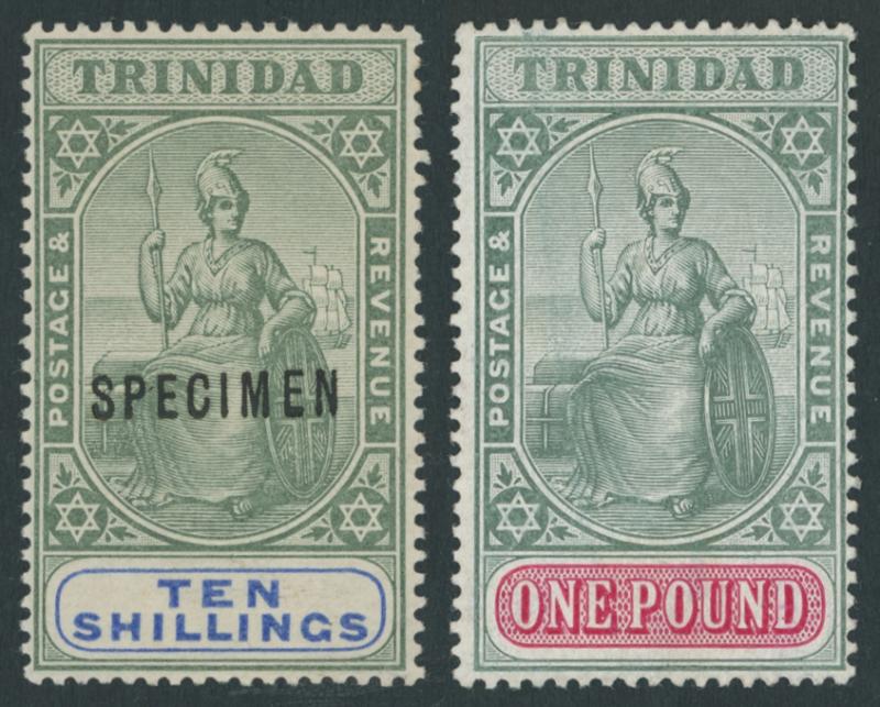 1886-1906 Trinidad Britannia Crown CA Watermark 5/- green & brown, 10/- green & ultramarine and £1 green & carmine with 'SPECIMEN'