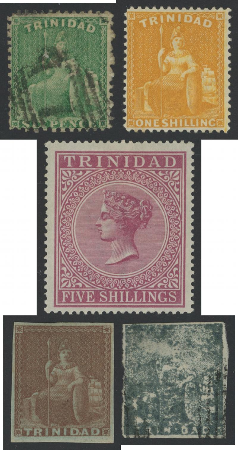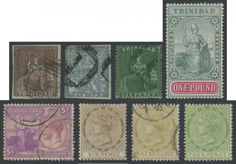 14-16½ 1d rose-red, 6d yellow-green & 6d deep green, and 1862-63 Perf 11½-12 1/- slate, plus Crown CC Wmk issues with a range of shades, then a range of later issues including 1904-09 Multiple Crown CA Wmk Britannia £1 green & red *; Tobago 1880 QV