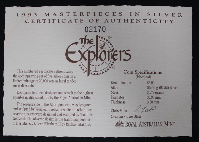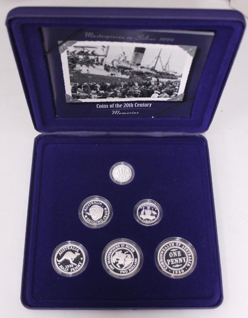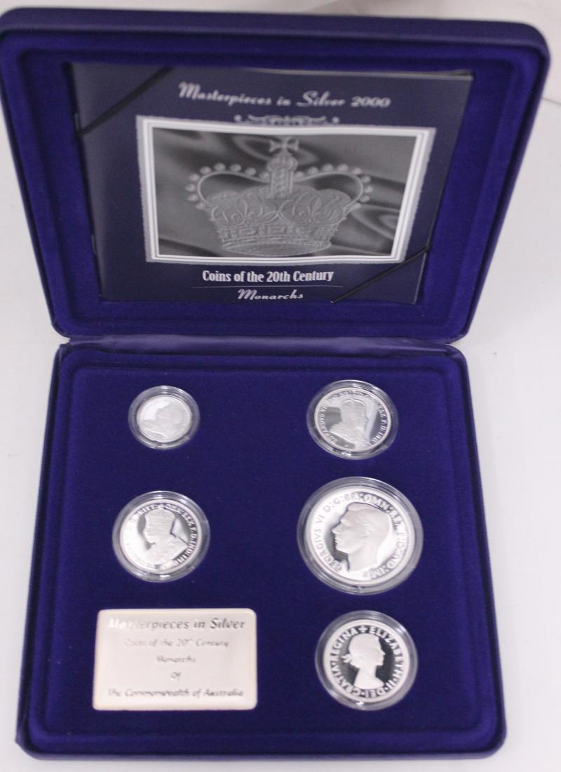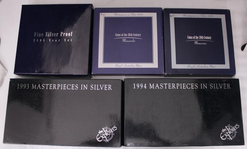 Masterpieces in Silver group comprising 1993 & 1994 'The Explorers', 'Coins of the 20th Century' - 1999 Memories & 2000 Monarchs;