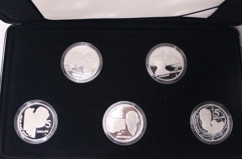 Silver product in box with $1/$5 1oz (0.999) 2000 Olympics-A Sea Change, & Flora and Fauna, 2001 Millennium coloured, 2002 Queen