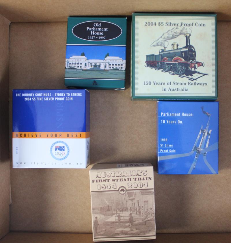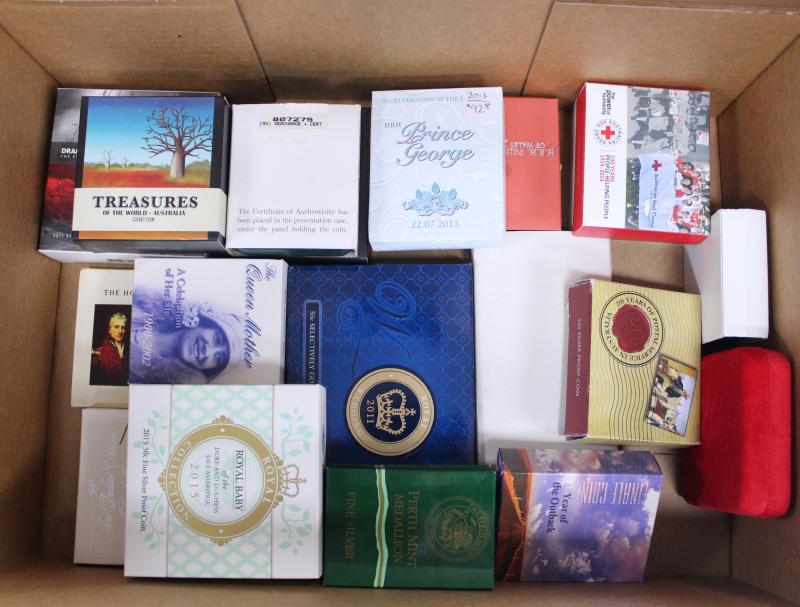 Mother, 2003 Coronation Anniversary, Prince William, 2006 Year of the Dog gold gilded (aged box), 2009 Postal Service coloured, 2013 Prince George, 2014 Red Cross, AAT Wandering Albatross, Treasures of the World Locket Coin (with gold inside), Anzac