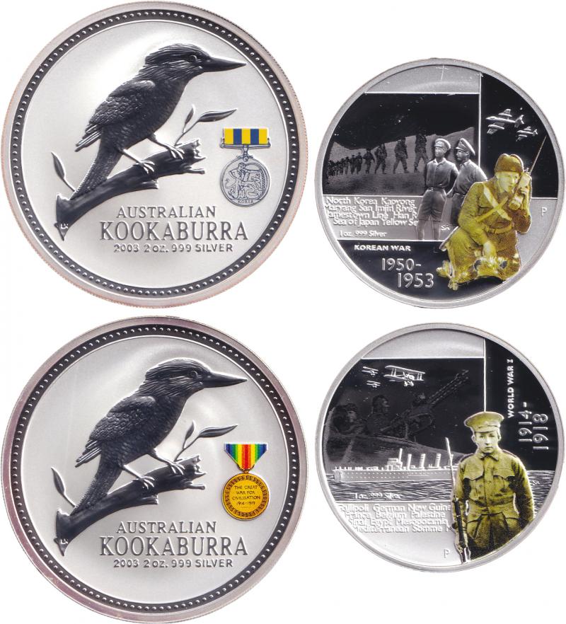 World War I themed silver group comprising 2003 $2/2oz+1oz Kookaburra/Medallion series for WWI, plus Korea (in WWI packaging) both