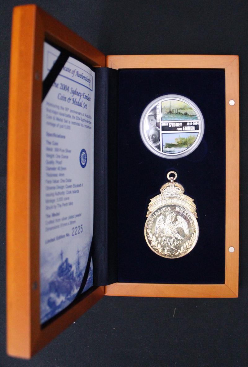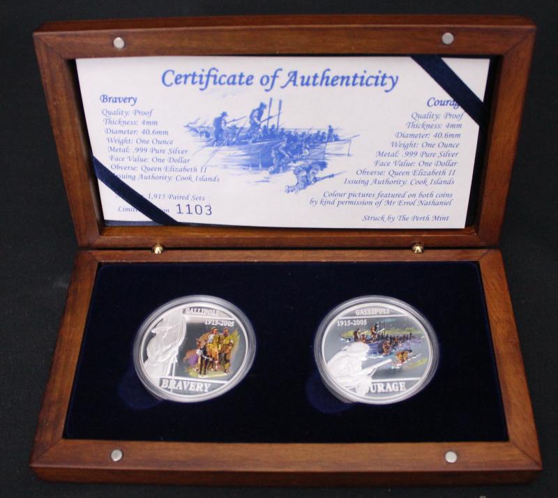 with correct certs; Cook Islands $1/1oz Two-Coin coloured Gallipoli, and Sydney/Emden $1/1oz x2; total asw 10oz.