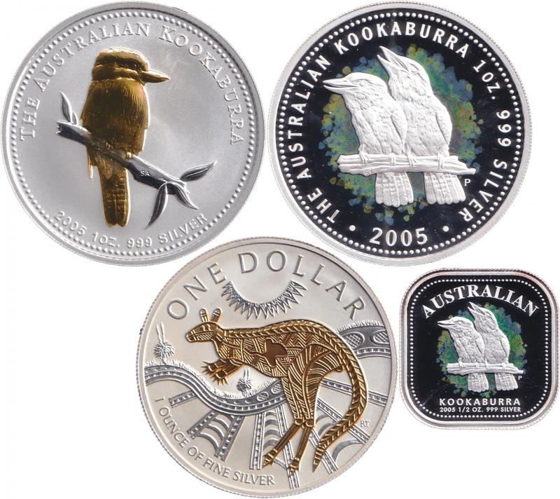 2005; plus Kookaburra Proof $1/1oz coloured and 50c/½oz coloured square; all cased with certs and cardboard outers, total asw 7½oz.
