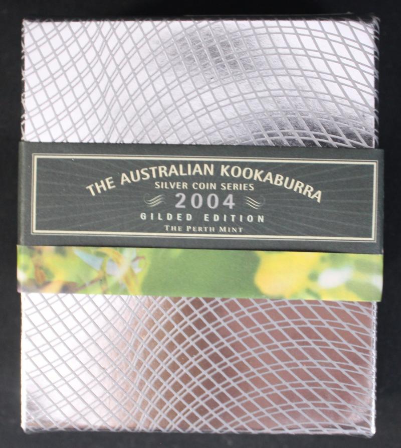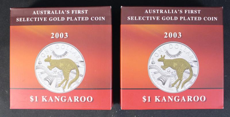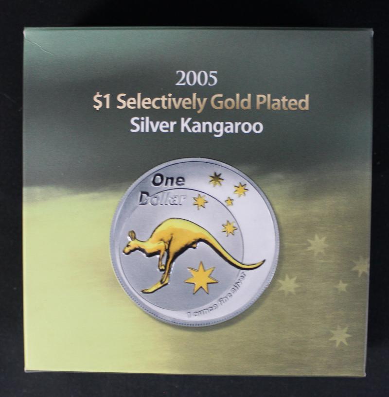 Selective Gold Plated Kangaroo group comprising $1/1oz (0.999) 2003 x3, and 2005; Gilded Kookaburra with pin $1/1oz (0.999) 2004, &