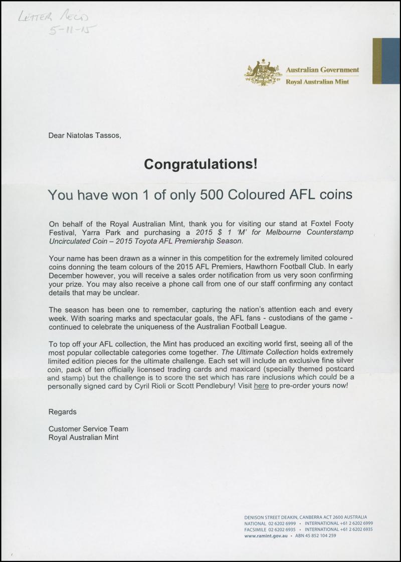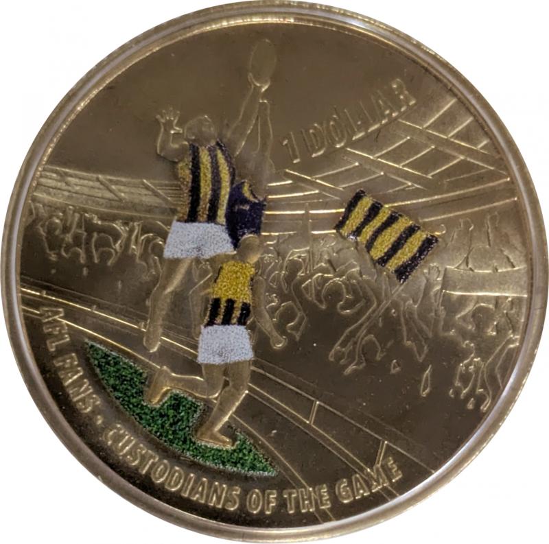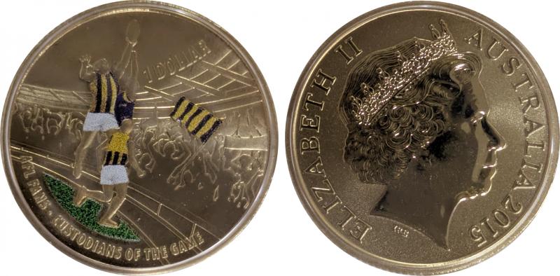 2015 $1 Hawthorn AFL Premiers in team colours, mintmark 'M', mintage 500, cased with certificate and RAM ballot congratulations