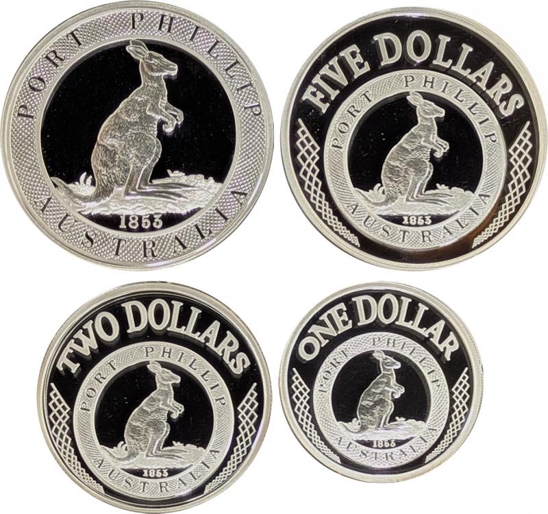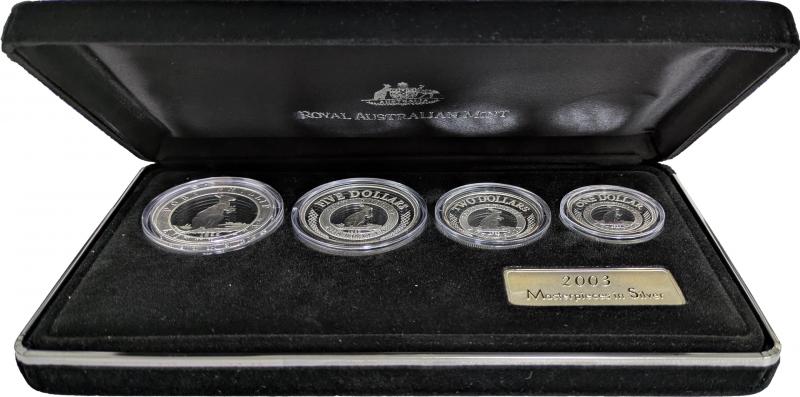 Silver group comprising Masterpieces in Silver 2003 Port Phillip Patterns; $1/1oz 2001 Kangaroo, $5/1oz 2002 Queen Mother, $1/1oz