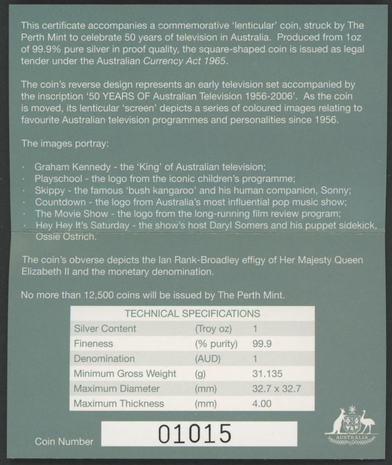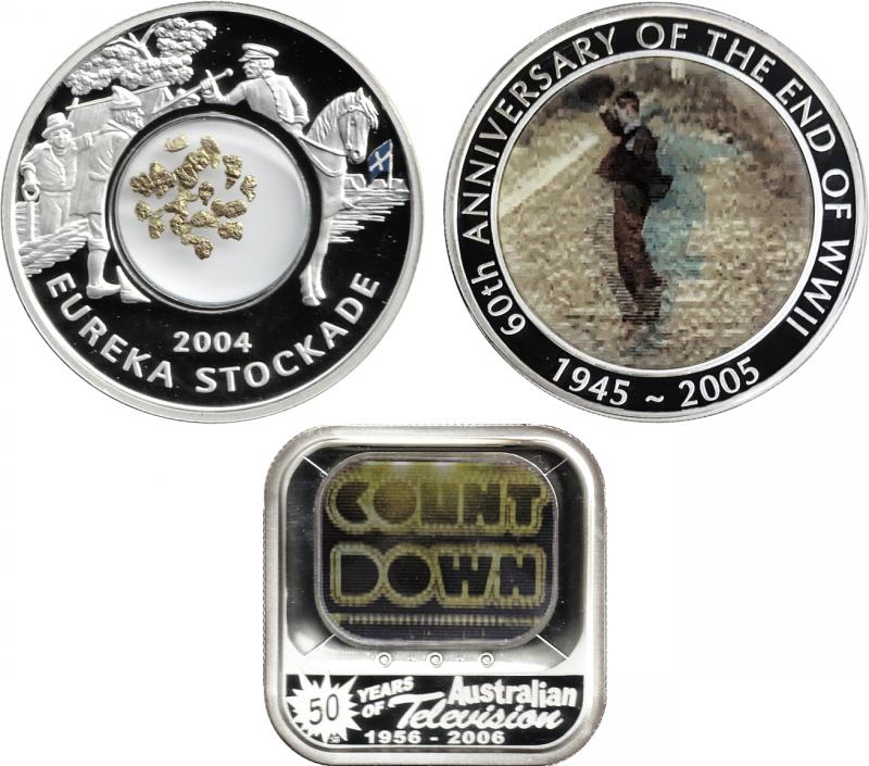 Lenticular 1oz silver 2005 Dancing Man, 2006 50 Years of Australian Television; plus Silver Locket 2004 Eureka with small gold