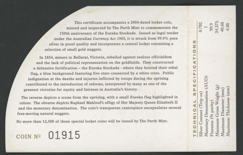 Proof; $1 (24g 0.999) 2004 Eureka Stockade Locket Coin with gold nuggets x2; $1 (24g 0.999) 2006 FIFA World Cup; plus China 2004 10¥/1oz (0.999) Panda gold plated, Mariana Islands $5 (25g 0.925) Magellan, and Isle of Man 2001 Crown (28g 0.925) Harry