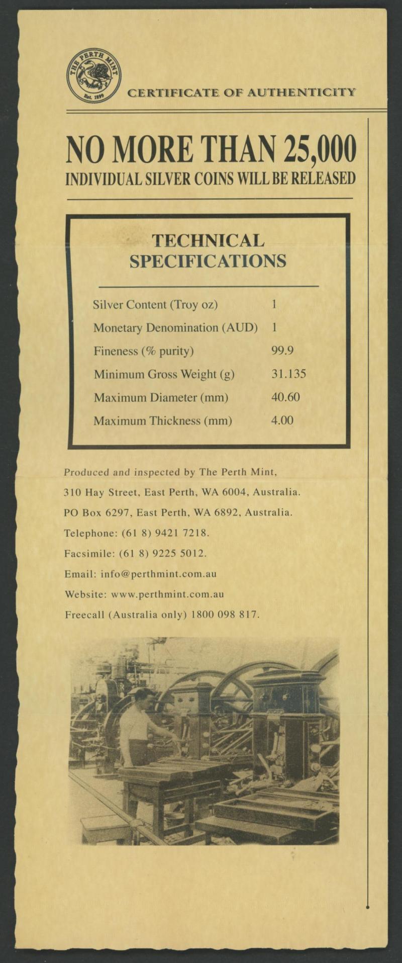 plus 1991 $10 (20g 0.925) Jabiru, Perth Mint ½oz medallions x4 (two named) including 1999 Quoka with suspension ring, 2000 Dragon; total asw 0.712kg, a few with damaged packaging.