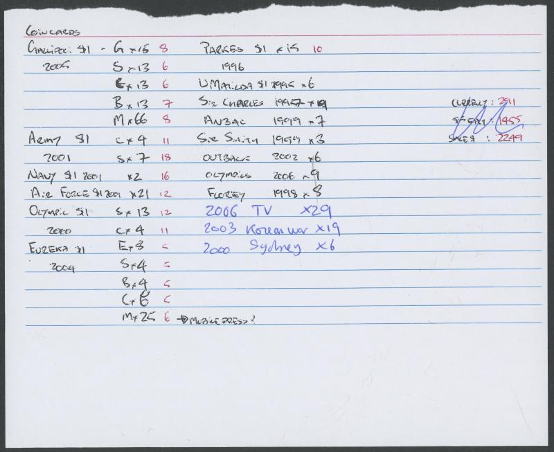 1996 Parkes x15, 2000 Victoria Cross x2, 2003 Vietnam x6, 2004 Eureka 'E' x8, 'S' x4, 'B' x4, 'C' x6, 'M' x25, 2005 Gallipoli 'G' x15, 'S' x13, 'C' x13, 'B' x13, 'M' x66, 2006 Television 'B', 'M', 'C' x2, 'S' x14, 'TV' x11, etc. Unc. See website for