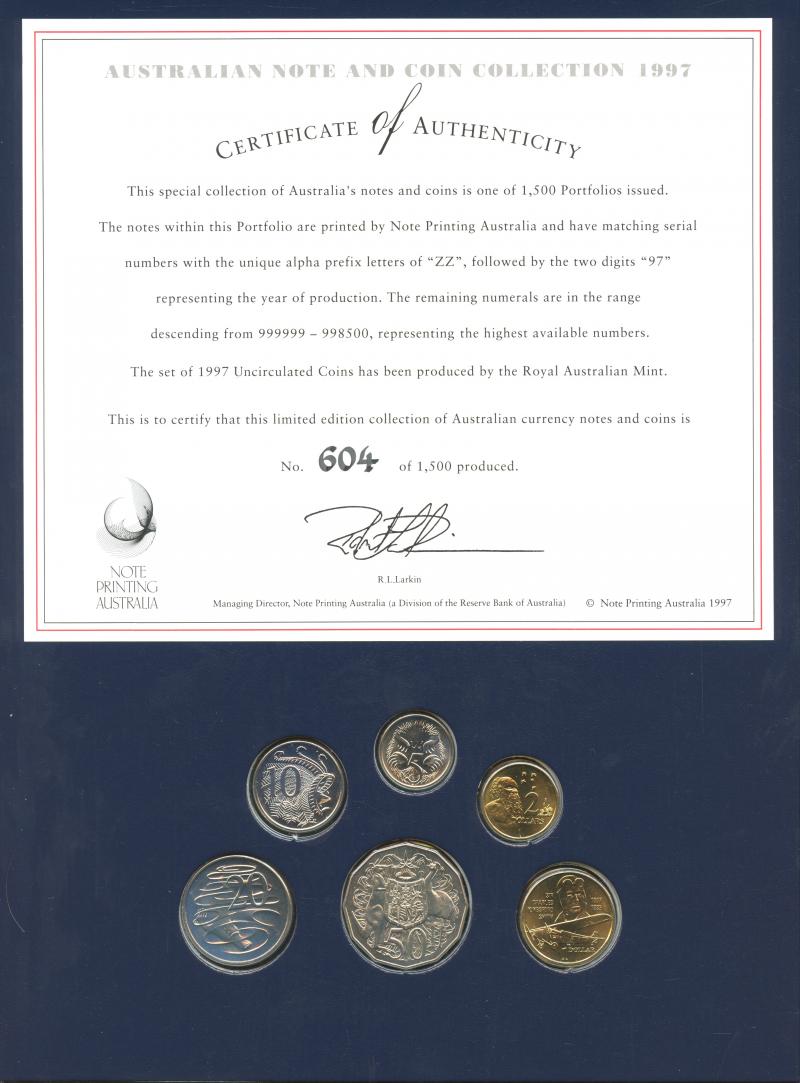 97 999396', plus 1997 5c to $2 Uncirculated coins, portfolio #604/1500, Uncirculated.