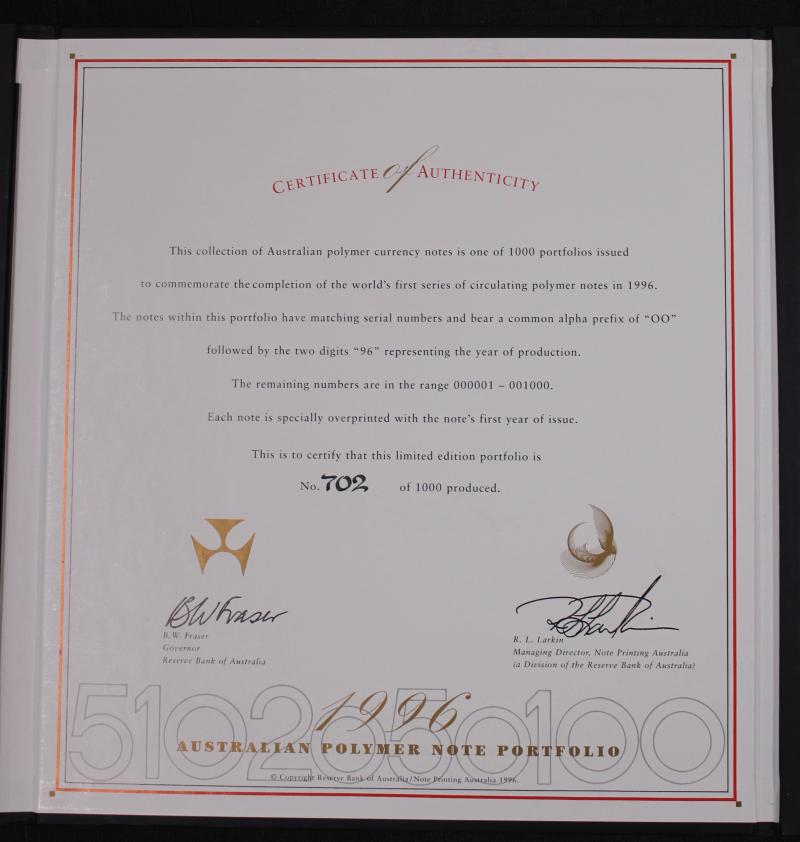 1996 'Australian Polymer Note Portfolio' R#B08, comprising Fraser/Evans dated $5 $10 $20 $50 & $100 all with matching serials '00
