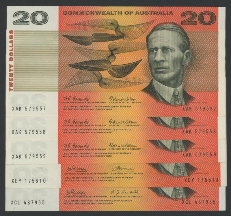 1966-1972 $20 group comprising 1966 Coombs/Wilson R401 consecutive run of three, 1968 Phillips/Randall R403, 1972 Phillips/Wheeler