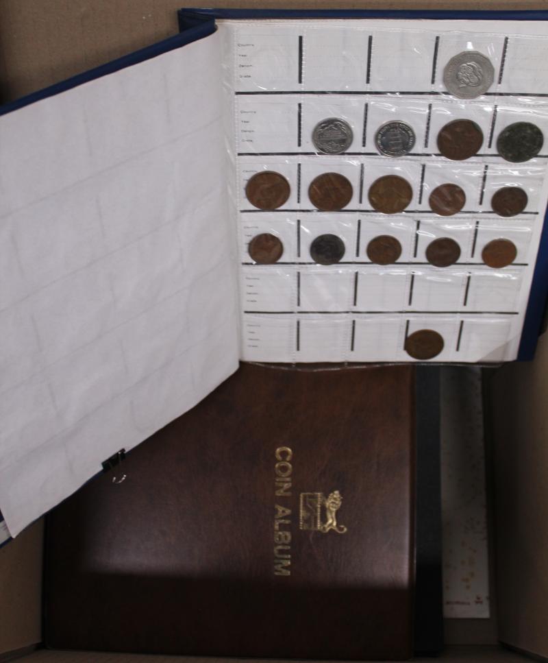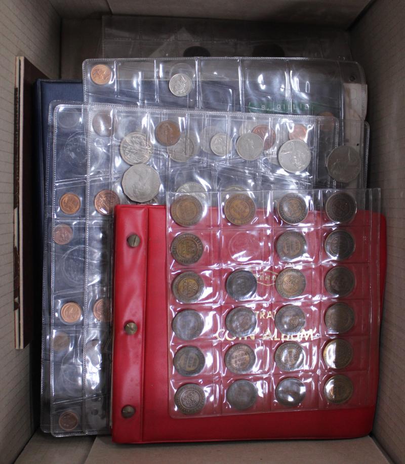 album pages containing Australia and British copper dates, and World coins; condition variable, personal inspection recommended. Weighs 28kg.