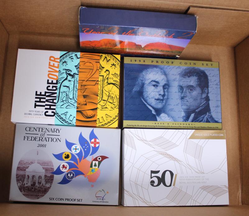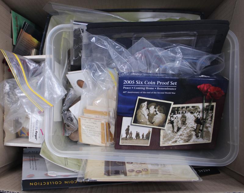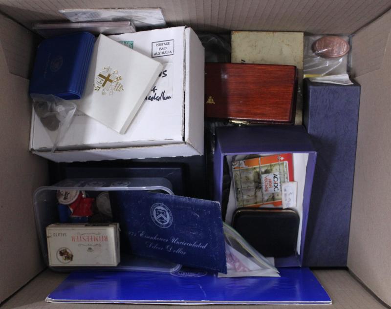 Proof set, Unc folders (8); plus World coins and medallions loose including Australia 1c mint roll (tails/tails), & USA 1960s-70s $½ & $1 Kennedy's, etc; personal inspection recommended; condition variable especially packaging. Weighs 13kg.