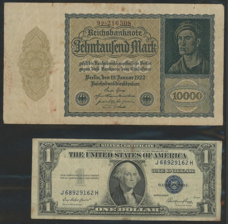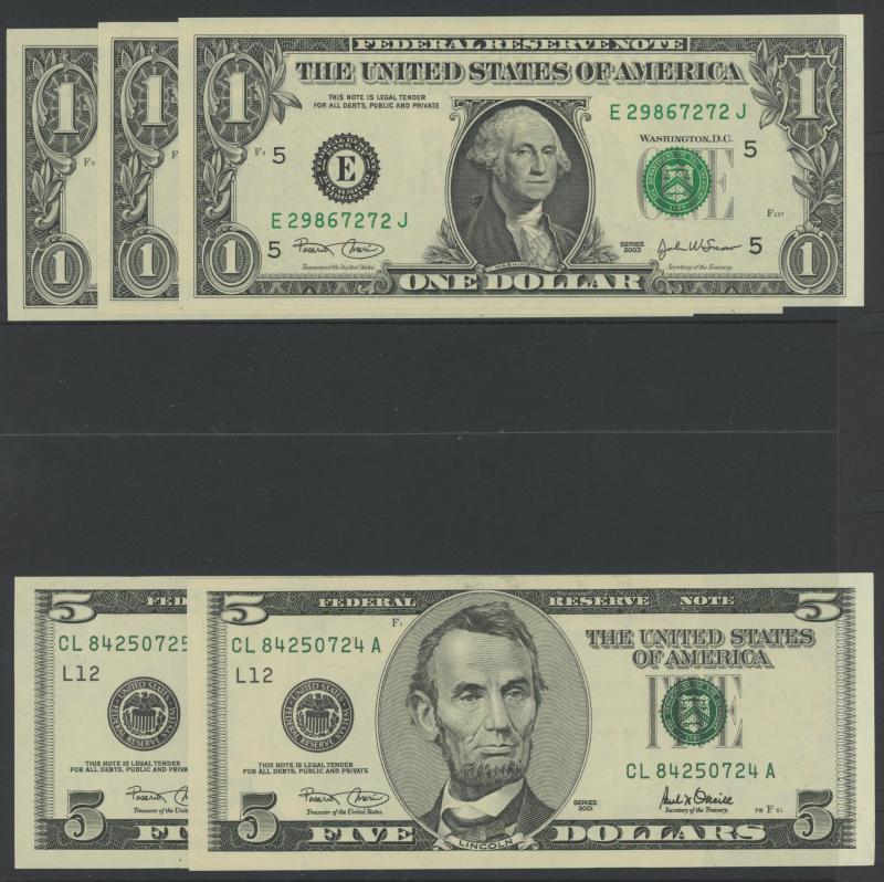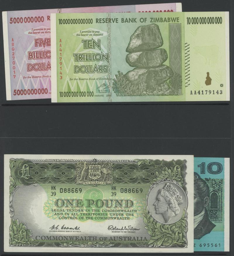 USA $1 2003 (3), $5 2001 (2), Zimbabwe 2008 $5 billion, and $10 trillion (described banknotes aUnc/unc), condition variable. Weighs 10kg.