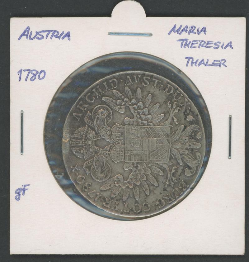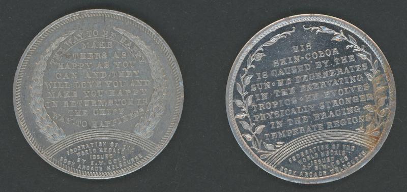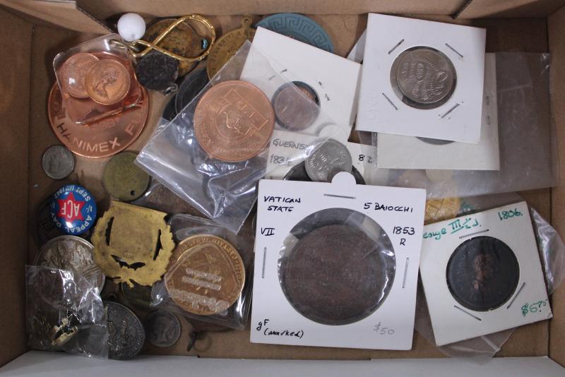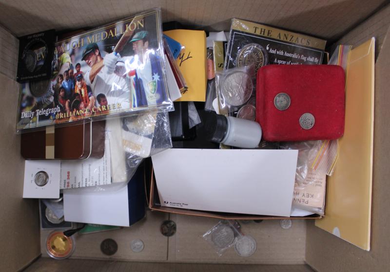 medallions including Stokes 1918 Dept. of Defence 'ENLISTED IN AIF 1918' # '5509', E W Cole 38mm 'The Way To Be Happy' and 'The Causes Of Variation In Mankind' in 'Box of Wisdom' tin case, Wrest Point Casino chips etc; Austria 1780 Thaler (2, x1