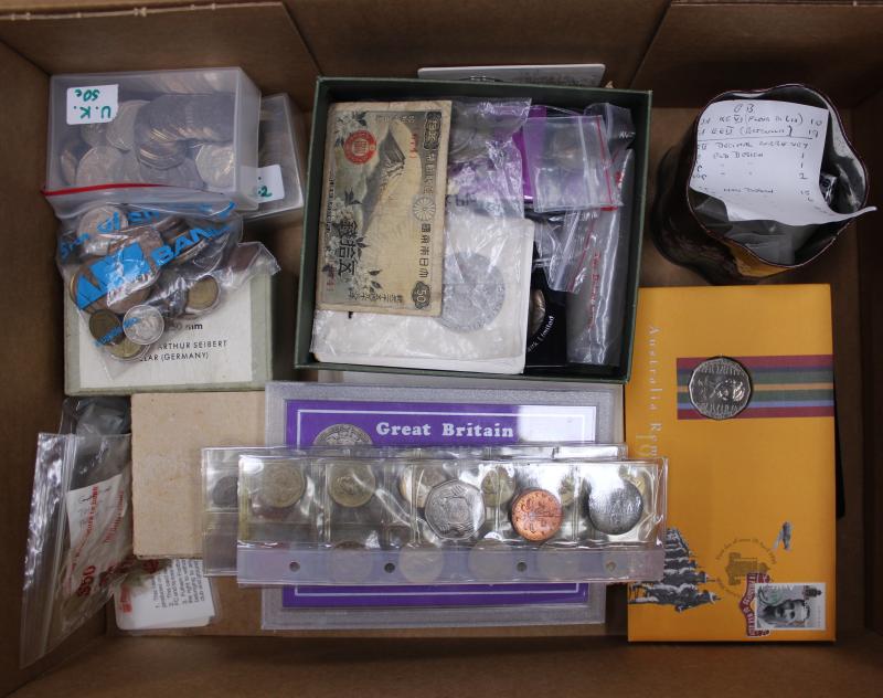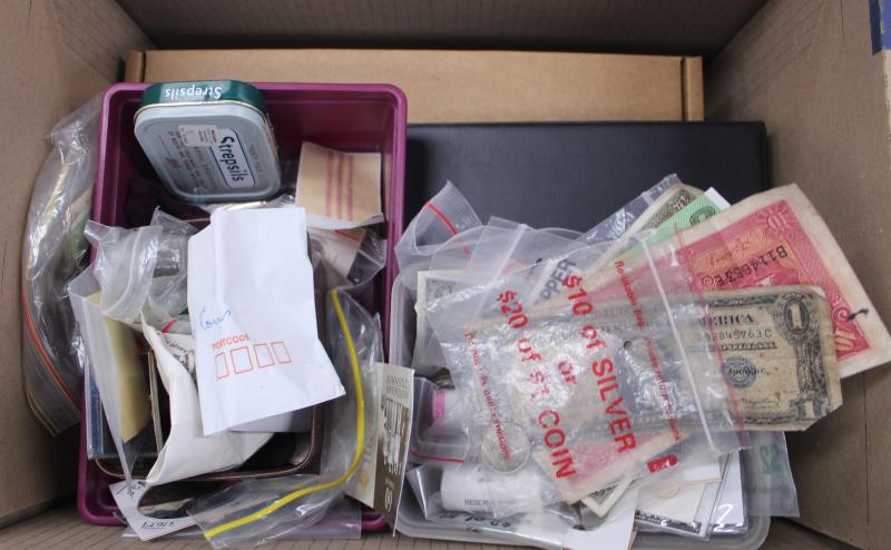 and USA; also a few World banknotes, pin badges, transit tokens, etc, condition variable. Personal inspection recommended and will reward. Weighs 35kg.