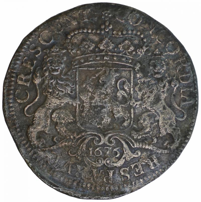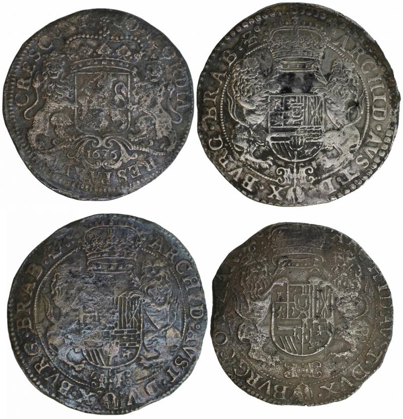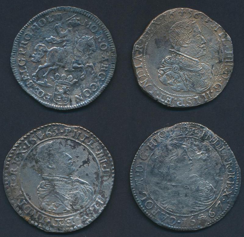 KM 79.2, mm [tree] Hertogenbosch; Flanders Ducaton 1656 Philip IV KM 50, mm [Lis] Bruges; Netherlands Holland Silver Rider 1676 KM 51, mm [rose] Dordrecht; plus unidentifiable coin embedded in piece of compressed sediment; coins with some pitting,