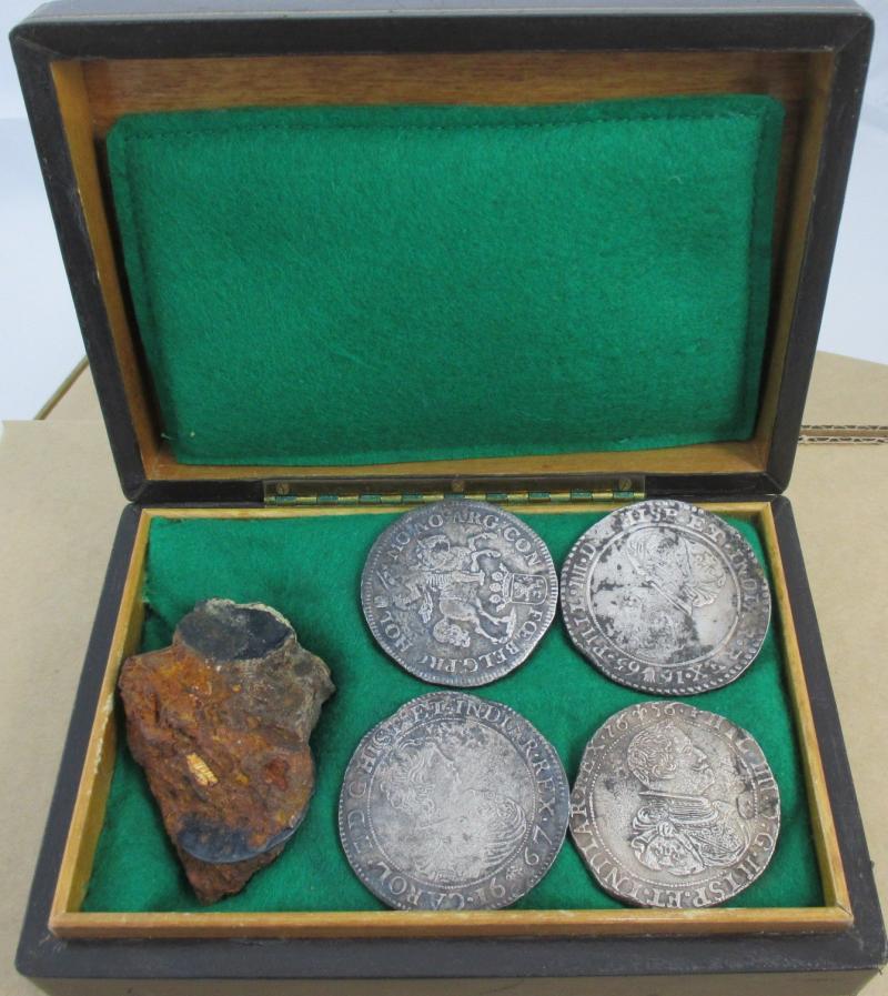 1702 Meresteyn Wreck silver coins comprising Spanish Netherlands Ducaton 1665 Philip IV KM 72.1, mm [hand] Antwerp, 1667 Charles II