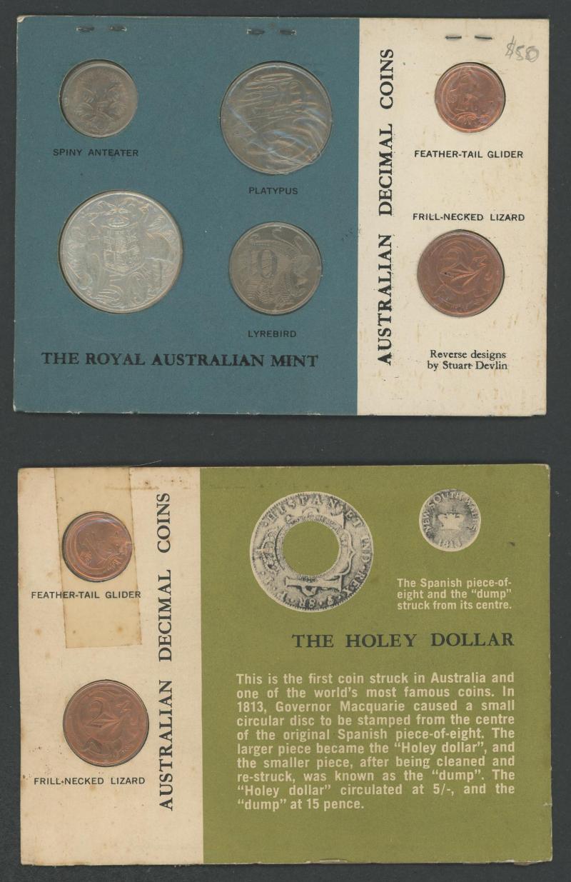 including 1923 eight pearls (two flat) centre diamond, polished, 1d 1913 aUnc/Unc, 1960 & 1963 clipped Florins, box of counterfeit lead Florins, 1966 Uncirculated set in RAM card, 1c & 2c 'Holey Dollar' Unc card, some additional RAM product, tokens,