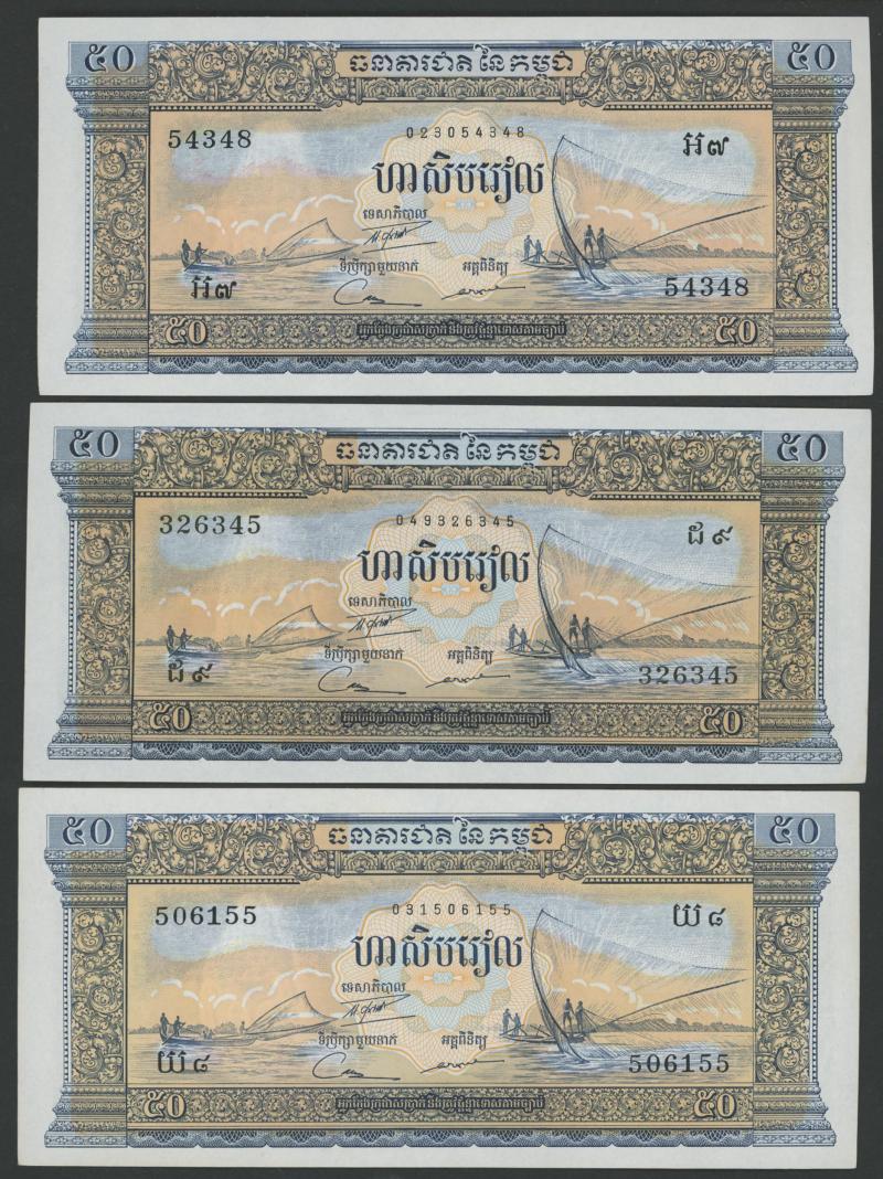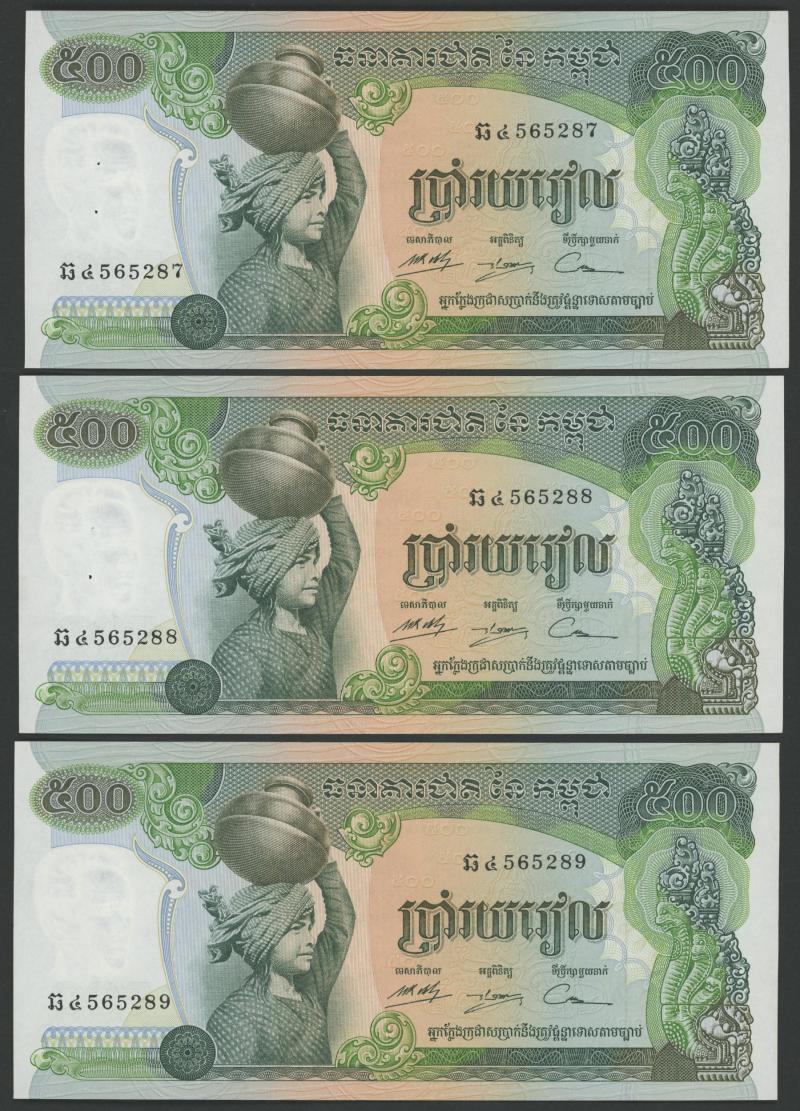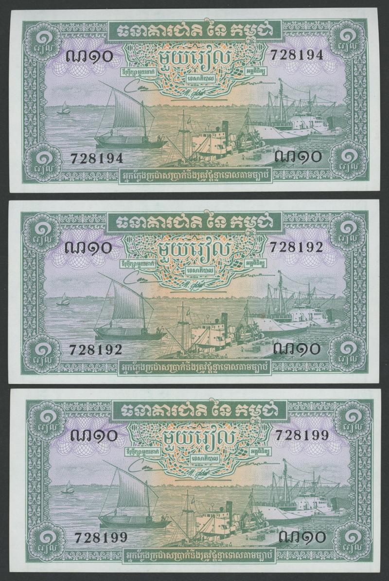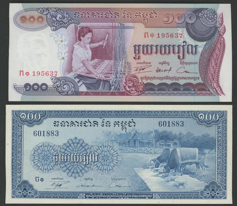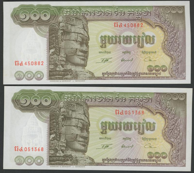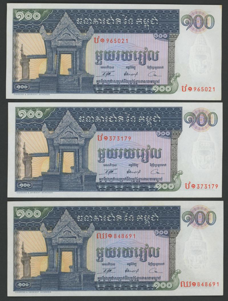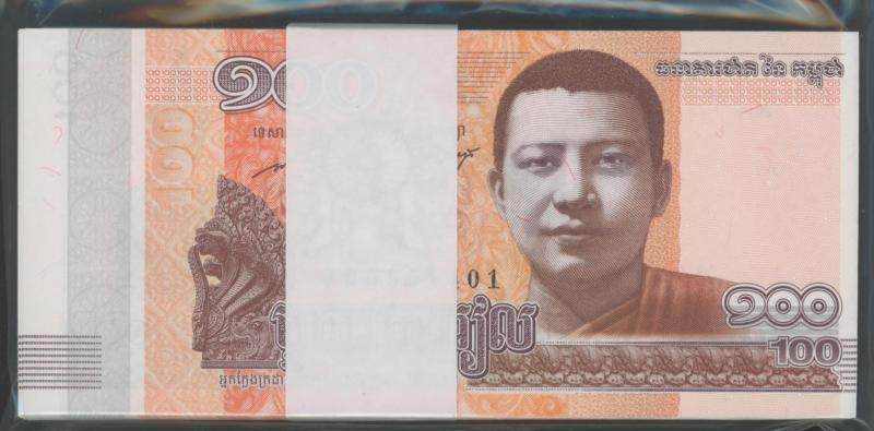 Bundles of 100 banknotes comprising Cambodia 2014 100 riel P65, India 5 rupees P88 (a few with tiny corner folds), Malaysia 1989 1