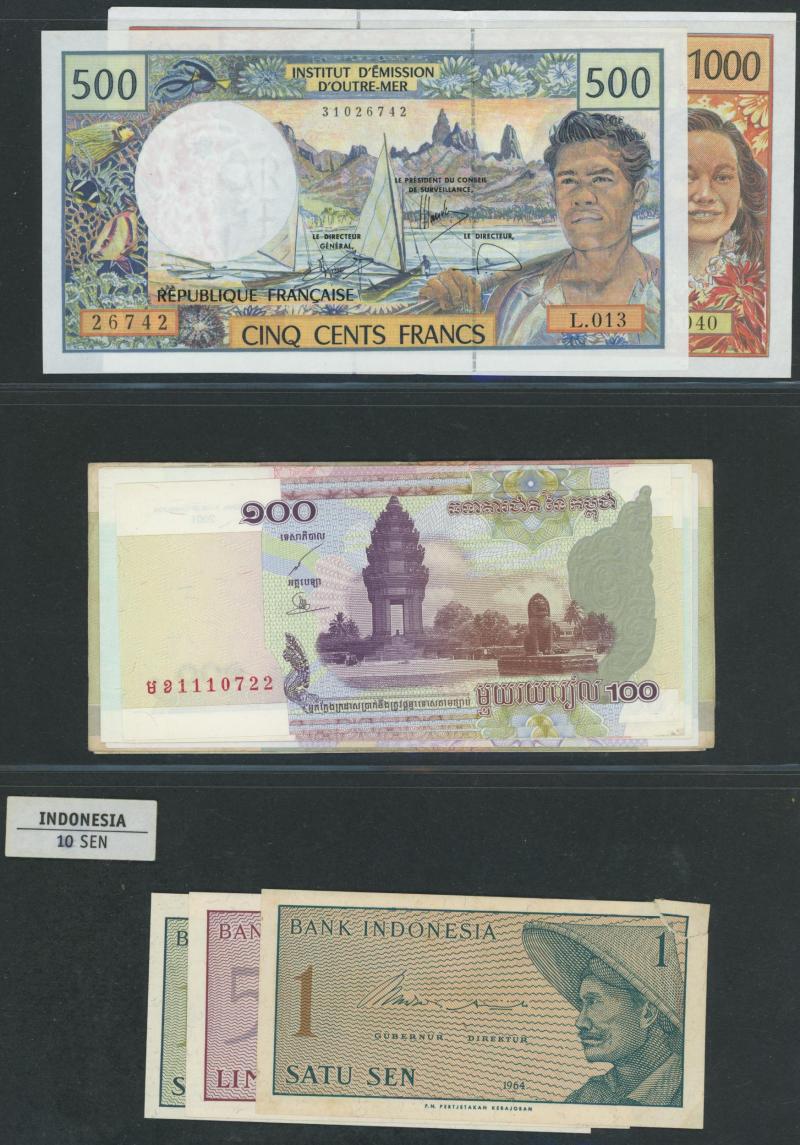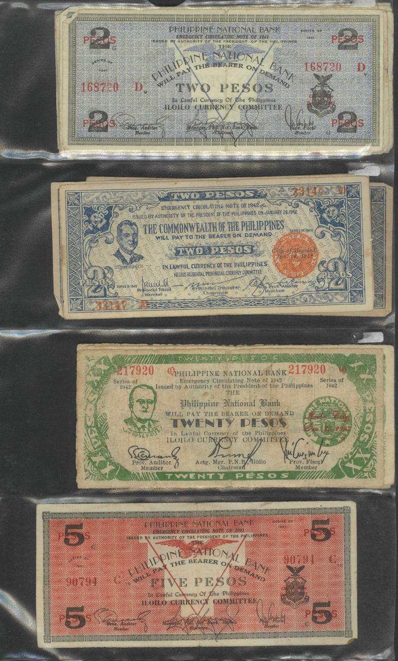 Netherlands-Indies; Philippines 1941-44 Emergency Circulating notes (42) with duplicates; also post-WWII from Argentina, Cambodia (58 mostly Unc), Ethiopia, Great Britain, Hong Kong, New Zealand, etc, condition variable.