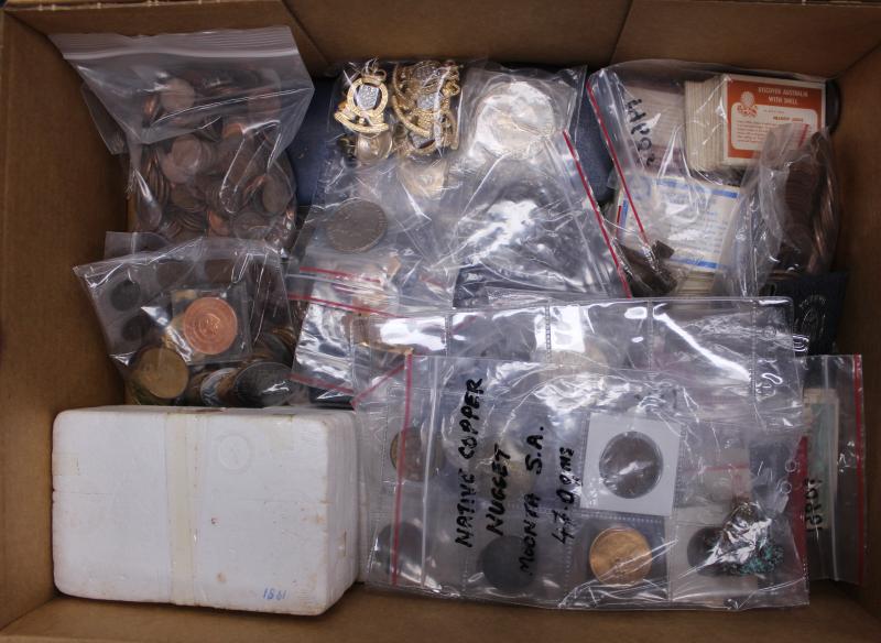 Consignment remainder coins in carton with Australia including 1ds 1964 (0.8kg), Six-Coin Unc folders 1977, & 1983, Proof sets