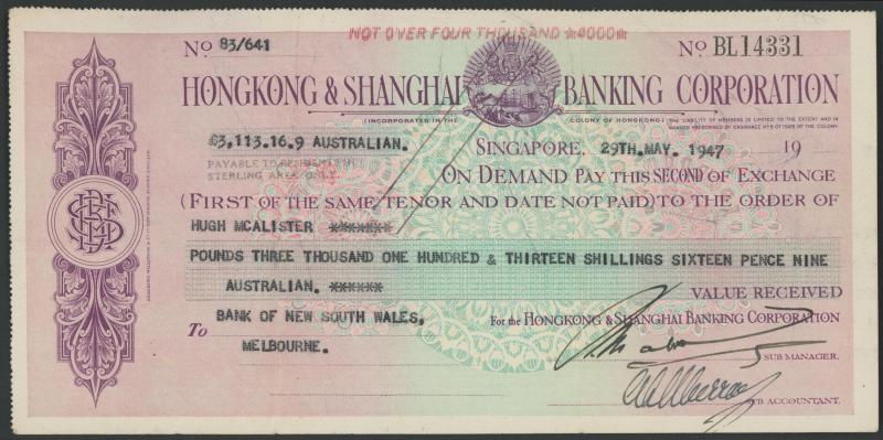 1/- (poor); Great Britain 1886 Colonial and Indian Exhibition London bronze medallion (52mm, cleaned); Singapore HSBC 1947 cheque for £3,113.16/9d, polymer notes face value $41; plus small amount of traveller's change; condition variable.