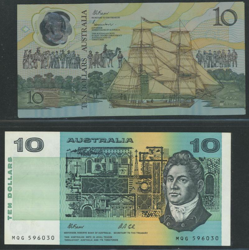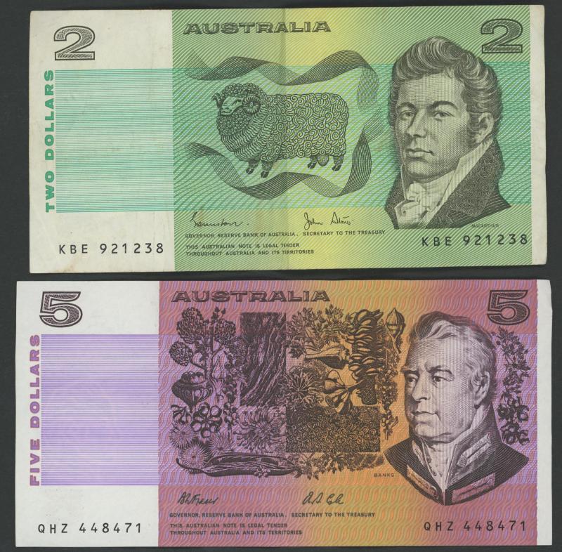 World banknotes accumulation in box including Australia with paper & polymer Decimals face value $130+; Euros f.v €40; Thailand