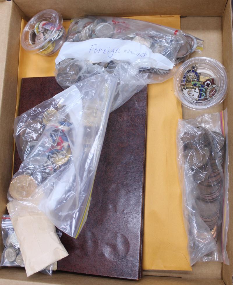 Dansco push-in album; World coins in bag (0.9kg) including Great Britain 1889 Crown; Netherlands 1930 2½g; USA $1 1921; plus pin badges & medallions including Australia WWII AIF Incapacitated Soldiers, Wattle Day, Comforts Fund, etc, and some Postage
