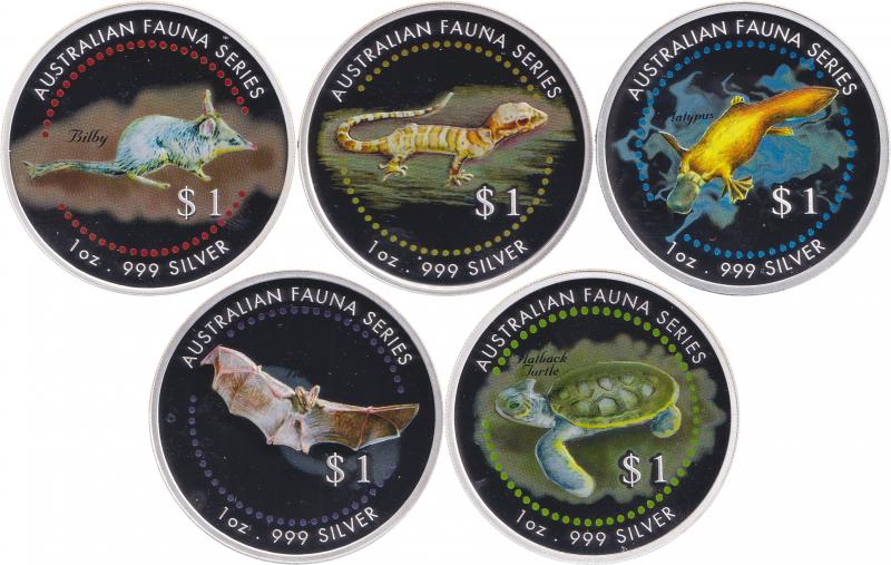 1998-1999 1oz Silver Australian Threatened Species $1/1oz (0.999) Perth Mint coloured sets of five comprising Fauna Series with