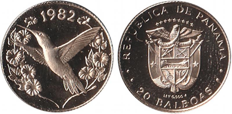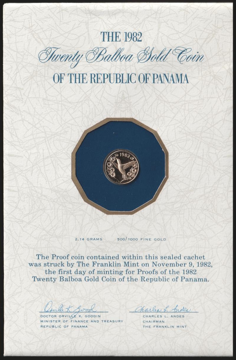 PANAMA: 1982 20 balboa gold (2.14g 0.500) Proof KM 81, rev. Hummingbird, in Franklin Mint wallet. (Image1) (Image2)